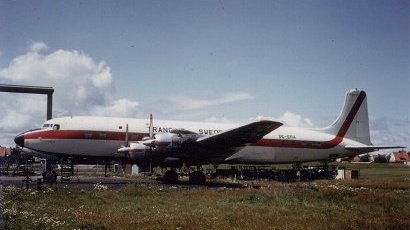 First delivered DC 7B became SE-ERA and was named Stockholm. Here it is parked outside the hangar.